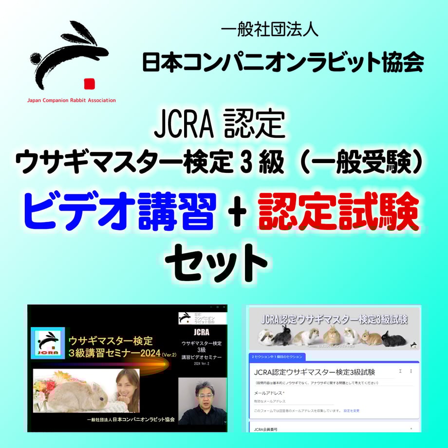 このたびは、一般社団法人 日本コンパニオンラビット協会(以下JCRA)公認のウサギマスター検定3級認定セットをお買い上げいただきまして、誠にありがとうございます。このセットは、ウサギマスター検定3級の講習ビデオと認定試験のセットとなります。